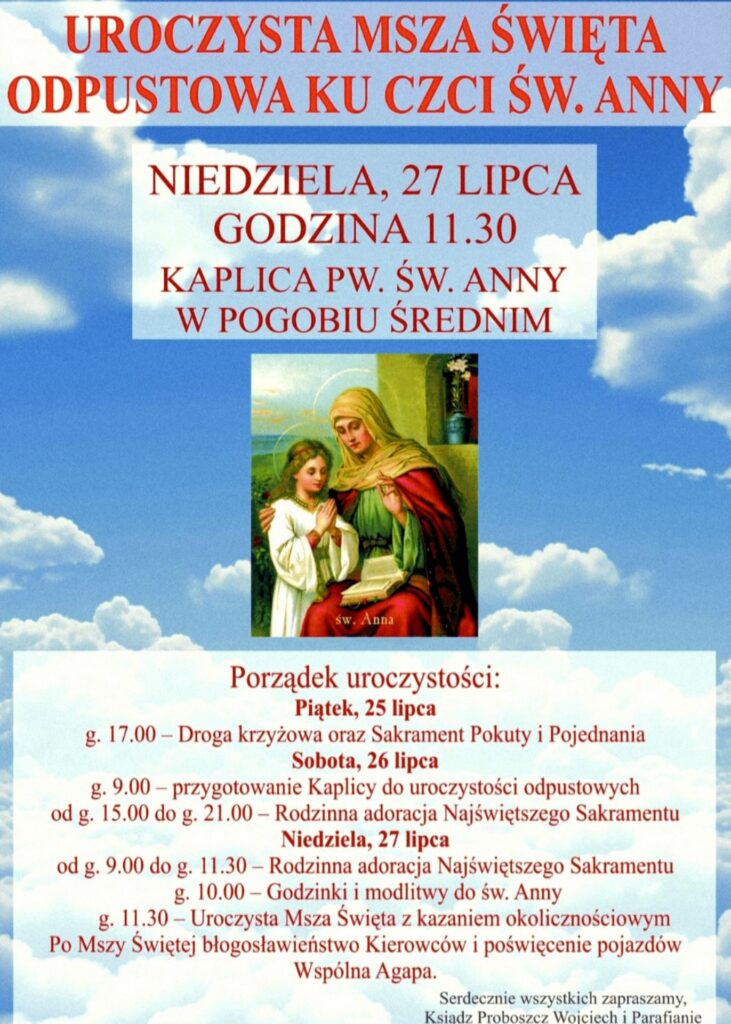 Niedziela, 27 lipca, g. 8.30, g. 10.00 i g. 16.00 oraz w Pogobiu Średnim o g. 11.30.